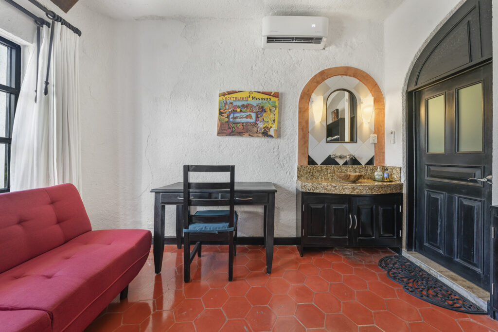 The Futon room is complete with ensuite bath and is located on the ground floor, perfect for setting up a massage table, or for those with mobility concerns. This room has easy access to the living/dining area, kitchen, lush courtyard and plunge pool. Sleeps 1.